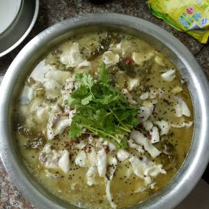 空汤里下入腌制好的鱼片,煮开,倒入刚才捞出的酸菜一起,放入蒜末,花椒黑芝麻,淋上热油