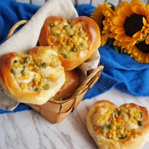 二发好,表面刷蛋液,用勺子把松仁玉米放上,表面洒上芝士碎,烤箱预热180度