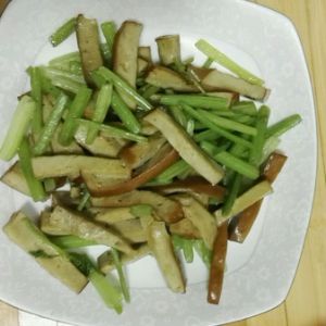 热锅放油,蒜瓣煸出香味,倒入芹菜丝和豆干丝,大火煸炒。加盐加鸡精,翻炒均匀,出锅。