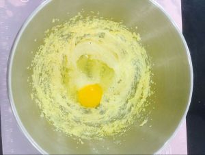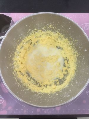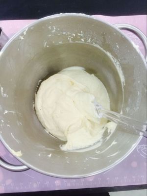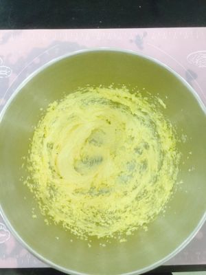 将黃油和砂糖放入盆中,用打蛋器打至发白。