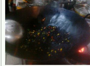 锅中加油放白糖炒化,加入烫好的黑米葡萄干玉米粒毛豆粒炒匀即可出锅。