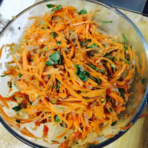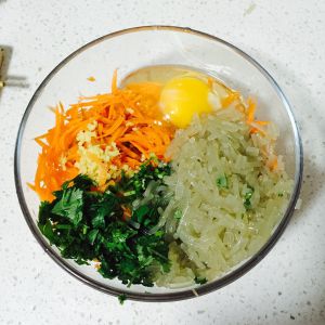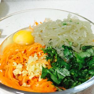 第一步。将胡萝卜丝、鸡蛋、香菜、粉丝、葱姜蒜末等放入碗内。