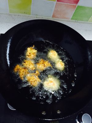 第五步。用勺子挖出小圆形放入8成热的油锅里开炸。炸至浅黄色用漏勺捞出控油。