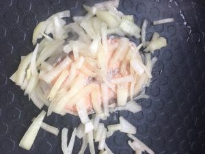 两面翻过后把腌鱼的洋葱加进锅里一起煎