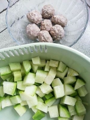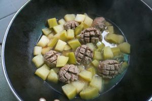 青萝卜切块,牛肉丸切花刀