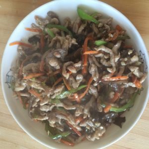 热锅中再放油,加葱姜蒜丝炒3秒马上加入胡萝卜丝青椒丝木耳丝翻炒1分钟,加入肉丝继续翻炒2分钟