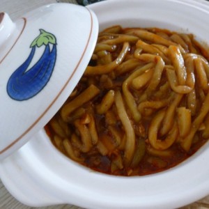 放入煸软的茄条,加白糖、酱油调味翻炒均匀融合香味,用少许水淀粉勾薄芡、加入蒜茸,放少许醋, 翻炒均匀即可出锅装盘