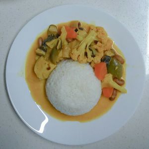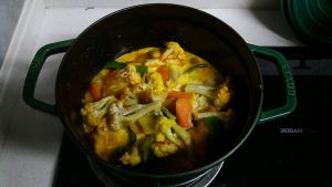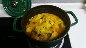 椰子粉加入热水调成浆,加入蔬菜锅中,烧开。