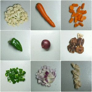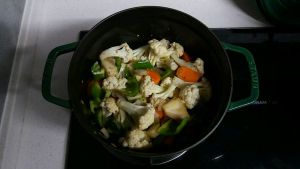 热火热油爆香蒜蓉辣椒,依次加入洋葱、青椒、胡萝卜,花菜,大火翻炒。