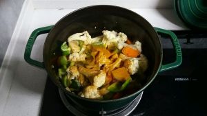 蔬菜稍微翻炒一会儿后,加入姜黄粉。
