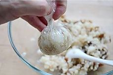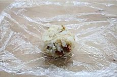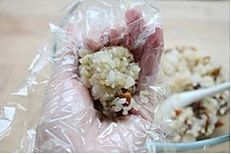 现在开始做饭团子。将一块保鲜膜放在手上,取一些糙米饭放在手心中间。