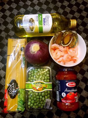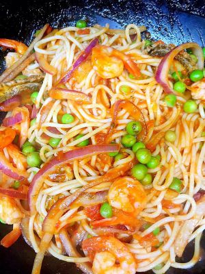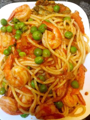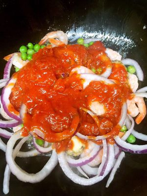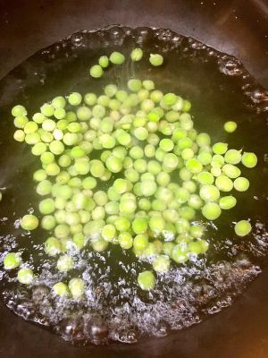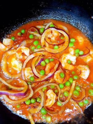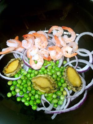 锅内放入适量橄榄油、将洋葱切圈后同甜豆粒、虾肉一起炒香