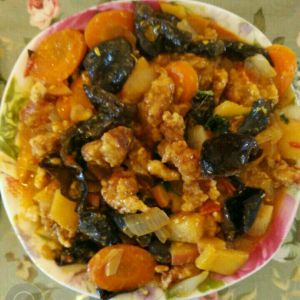 将胡萝卜,洋葱,西红柿,苹果切成小块或片用炸肉的油炸一遍备用,在干净的锅中放少许油,将炸好的蔬菜炒几下,加入少量水,加三勺酱油,两勺醋,糖根据自己口味酌情加入,我加入的较少,两小勺,喜欢甜的可以多加一点。加入淀粉勾芡,出锅。