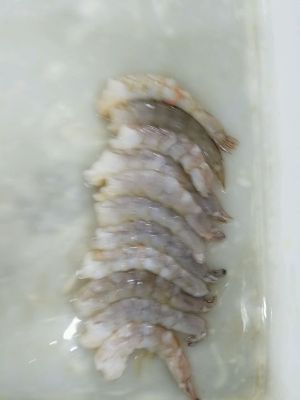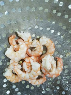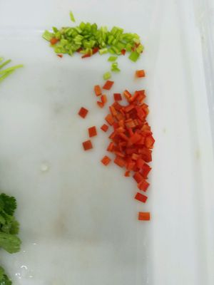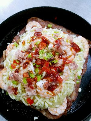 把我们准备的虾仁摆好,红椒青椒碎撒上。对了,之前培根可以切一点碎趴在上面(要生的要不然烤糊了)