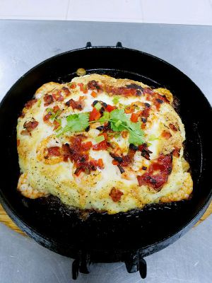 出菜,再撒一点点新鲜的,点缀一下,哇塞奶香四溢!超级无敌霹雳旋风培根虾仁芝士土豆泥就摆在你面前了,从头到尾没放油哦,这道菜应该热量还可以接受!放心吃吧