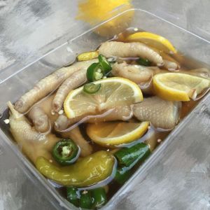 柠檬切好后和泡椒一起放进糟卤中,倒入一点生抽和糖盐。