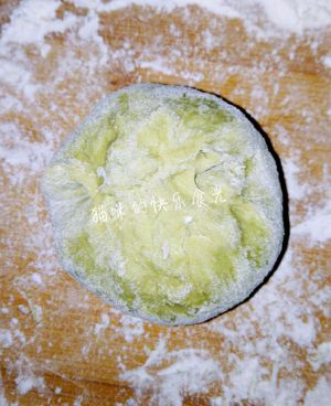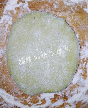 取1个松弛好的抹茶面团,擀成圆形。