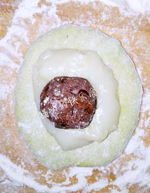 麻薯面团用手压成比抹茶面团稍小的圆形,盖在抹茶面皮上,再在麻薯面皮上面放上豆沙馅。