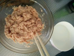 取出打好的肉馅,倒入去掉花椒的花椒水适量,顺着同一个方向搅拌,前面也可加入一点鸡精~完毕,另倒一杯清水准备包馄饨啦