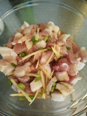 肉去皮去筋,切丝~除花椒以外所有材料放入碗中,分量随自己口味