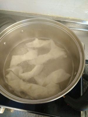 水烧开,加入一点点盐,馄饨就下锅开煮了。中途沸腾后加入一点冷水,转中火再煮到漂起即可