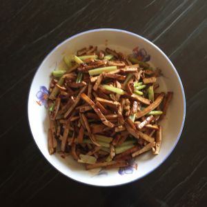 炒锅倒油烧热放入豆瓣炒香后,下入香干翻炒均匀倒入芹菜加少许清水炒至断生,放入盐、味精调味即可起锅装盘食用!