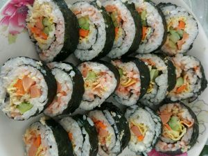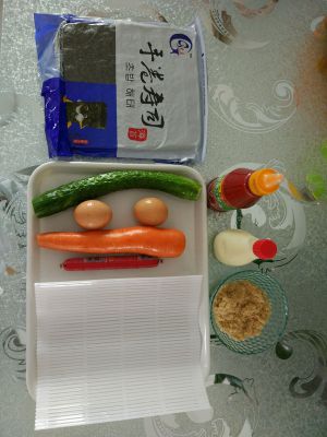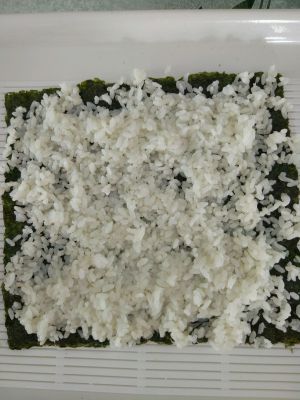 把寿司海苔平铺寿司卷上,均匀的放上米饭。