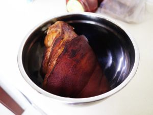 大蹄膀烙皮刮洗干净,旺火煮10来分钟后捞起。在肉皮上抹酱油和融化后的红糖上色,入油锅里炸得肉皮金黄起皱,再入锅煮几分钟后捞起。老实说,此步骤其实比较难操作,特别是在炸的时候,还得防止油花四溅伤手。起先没打算写菜谱,所以煮蹄膀和炸制的过程没有拍图,下次再做的时候补上。