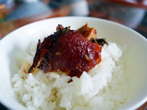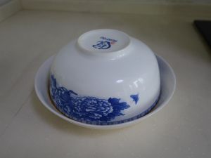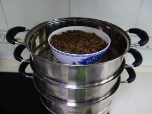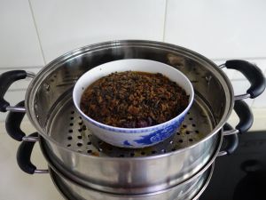 碎粒咸菜放入腌好的蹄膀中,同样也压得紧实一点。开大火,加盖蒸约两个小时。我家的双层蒸锅,刚好两碗一起蒸。