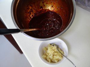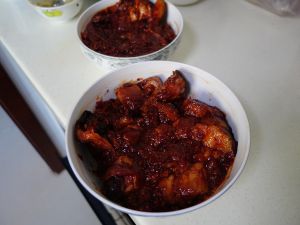 开始调制蹄膀腌料。我放的腌料有:郫县豆瓣、白胡椒粉、料酒、白糖、花椒粉、花椒油、香油、酱油、醪糟汁,另外还有捣好的姜蒜茸。所有的腌料混合搅拌均匀。图片所示的腌料和姜蒜茸我只用了其中部分,因为当天同时还做了粉蒸排骨和其他凉菜,也要用到这些调料。