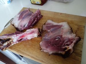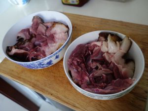 蹄膀剔骨留肉,因为比较大,分成两块,这样刚好可以制作两碗咸菜蒸蹄膀。