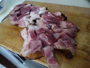 去骨后的蹄膀翻过来将肉切成四方的块,但肉皮不要切断。