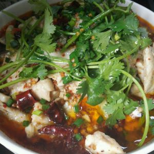 煮鱼的照片没拍.顾不过来…说一下,就是烧开后,把鱼片放进锅里,不用搅,这样鱼肉会散开,会烂.鱼片入锅十五秒这样即可捞起.这样的鱼肉很嫩,不老.准备一大汤碗将烫好的豆芽放在汤碗底,鱼片放在豆芽上面,然后将红油汤倒入,在撒些葱花,放几把香菜,另外烧些热油,冒烟的那种,烧好后直接淋盖在表面上,这样水煮鱼就好了.