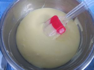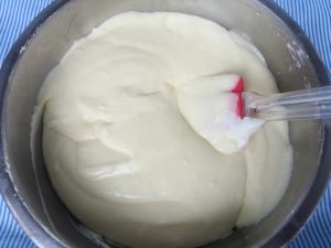 淡奶油加入蛋黄糊用刮刀混合均匀。