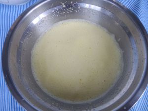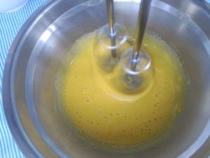 糖水慢慢加入蛋黄液中,边倒边开动电动打蛋器搅打均匀。