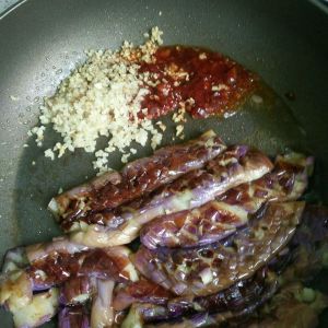 茄子煎软,拨到一边加姜蒜粒,豆瓣酱。