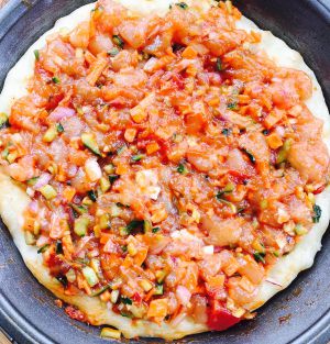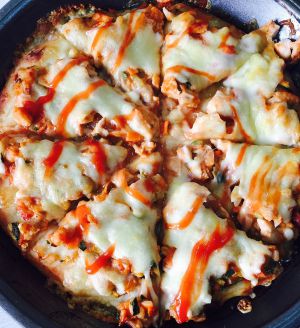 发好的面团杆饼,刷披萨酱,撒上鸡肉陷