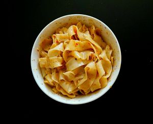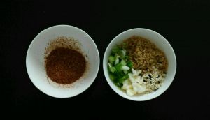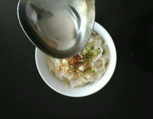洒上盐、葱蒜,花生芝麻、辣椒面。 烧热菜籽油,泼在面上。