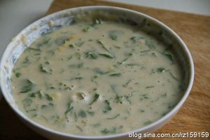 将面粉和芹菜叶、玉米粒放入大碗中 打入鸡蛋 加盐、水拌匀至稀糊状