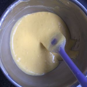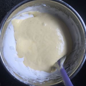将搅拌好的面糊倒入剩下的蛋白霜中。