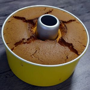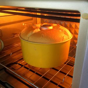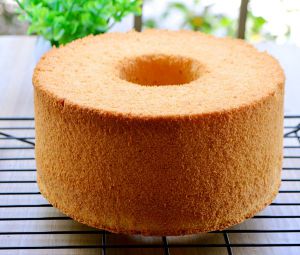 烤好后立即将蛋糕取出震两下,排出热气,然后倒扣在酒瓶上晾凉。当蛋糕完全冷却后就可以脱模食用啦~