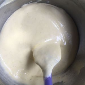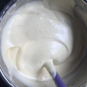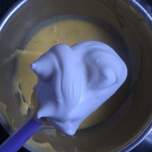 取1/3的蛋白霜加入蛋黄糊中