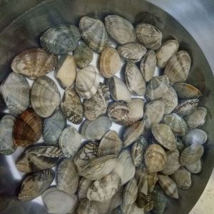 把新鲜花蛤泡到水里,加入盐,香油,让花蛤吐沙子