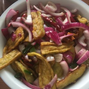 锅中放少许油,加入葱段,蒜片,干红辣椒,洋葱,青红椒,放少许醋,白糖放一点,盐,放入炸好的茄子,稍微翻炒一下出锅