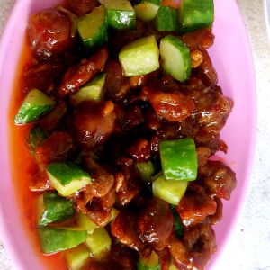 另起锅热油放糖黄瓜翻炒片刻加入炸好的里脊肉,然后倒入甜辣酱翻炒均匀即可。简单又好吃