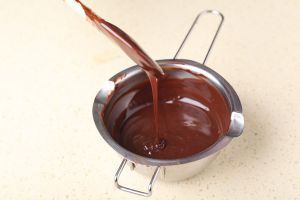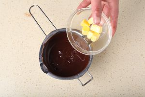 加入切碎的黑巧克力和黄油,静置5分钟。然后搅拌至巧克力和黄油都融化,成为光滑的甘纳许溶液
