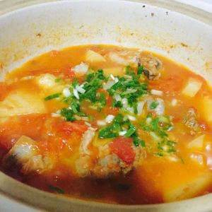 把土豆和排骨倒进砂锅里煮,加入盐。番茄太酸,所以我又加了一些糖,大概10-15分钟?忘记了……土豆要熟一点才好吃哦,用筷子戳一下试试,最后关火前撒葱花
