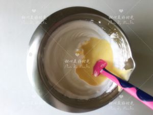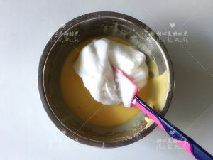 挖三分之一蛋白霜加入蛋黄糊中,进行翻拌(不要划圈)