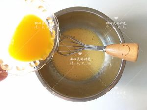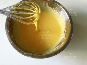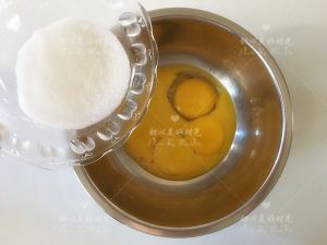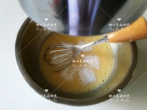 将细砂糖(蛋黄)加入分离出的蛋黄中,搅拌均匀至细砂糖溶化