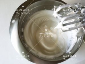 蛋白中加入几滴柠檬汁,打至粗泡后,分三次加入细砂糖(蛋白),打至硬性发泡